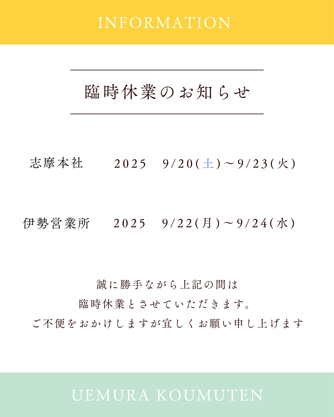 志摩本社→9/24(水) 伊勢営業所→9/25(木)